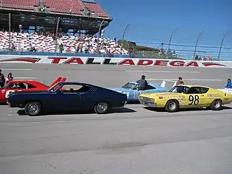 The Ford Torino Talladega is a muscle car that was produced by Ford only during the first few weeks of 1969. It was named for the Talladega Superspeedway, which opened the same year. The Talladega was a special, more aerodynamic version of the Torino / Fairlane produced specifically to make Ford even more competitive in NASCAR racing, and it was sold to the public only because homologation rules required a certain minimum number of cars (500 in 1969) be produced and made available.