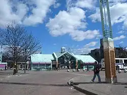 In between the two buildings is the Fordham Plaza Bus Terminal (4750 Third Avenue),[21] encompassing Third Avenue and the former right-of-way of Park Avenue on a "bridge-structure" over the Metro-North Railroad tracks. From 1997[22] to early 2013,[21] this was also the location of a cobblestone-paved outdoor market space. This included tents and stands for items such as fruit. At its north end were two concession stands built into the southern entrance stairs to the Metro-North station. Throughout the plaza were several obelisk-like pillars, some of which were combined with canopies and glass bricks to form bus shelters.[5][23][24]