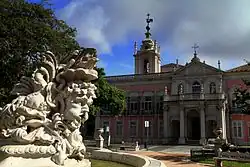 The Palace is composed by an architectural complex which includes a church, a convent and a royal palace, built between 1743 and 1752. This palace is an example of the joanine baroque architecture, with a visible Italian influence which characterized the architectural production under royal patronage, during the joanine period. The Palace has a complex blueprint, which is the natural consequence of the articulation of the distinct bodies which form the palace, and is spread around two square patios.[7]