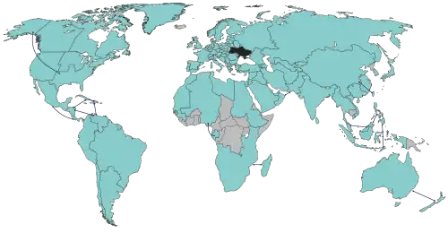 The foreign electoral district of Ukraine (Ukrainian: закордонний виборчий округ України, ЗВО) is an electoral district which unites electoral precincts situated outside the territory of Ukraine and which comprises all polling stations located inside embassies and consulates of Ukraine and inside military bases abroad, where there are Ukrainian peacekeeping contingents (Kosovo and DR Congo).[1] The responsibilities of district election commission for the Foreign electoral district are carried out by the Central Election Commission. In this district, only nationwide votings are held, i.e., presidential and parliamentary elections, as well as nationwide referendums. Local elections are not held there.