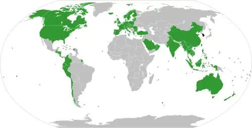 - For economy and finance: Club de Paris, IFC, IBRD, IDA, OECD, MIGA, ICSID, ADB, AIIB, AfDB, AfDF, EBRD, IADB, MIF, CFC, CABEI, BIS, South East Asian Central Banks, Executives' Meeting of East Asia and Pacific Central Banks, FSB, World Bank (MIGA), EBRD, ITC, WTO, IMO, IMF, WBG, IPEF, APEC