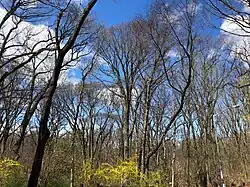 Forest Park is situated atop the Harbor Hill Moraine,[5][63] which, at the time of the park's construction, was a heavily forested ridge.[15] The highest point in the park is about 180 feet (55 m) above sea level.[44] The park contains approximately 411 acres (166 ha) of hickory and oak trees.[62] These include a 165-acre (67 ha) forested section in the eastern half of the park. In addition, Forest Park contains 7 miles (11 km) of bridle paths.[61]