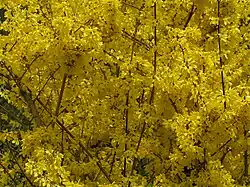 Forsythia are early spring-flowering shrubs with yellow blooms,[20] often seen in private gardens, public landscaping works and parks—notably during Eastertide), when some of the plants are nicknamed Easter Tree in honor of the coming spring.[21] Two species/hybrids are commonly cultivated for ornamental use, Forsythia × intermedia and F. suspensa. They are grown in several climates and gardening zones, prized for being tough and reliable perennial plants. F. × intermedia is the more commonly grown, smaller plant and has an upright habit with vivid flowers. F. suspensa is a large to very large shrub with paler blossoms, and can be grown in a weeping shape on banks. Many named garden cultivars can also be found. Budding Forsythia cuttings are frequently brought indoors, for their opening blooms, in the early spring.[7]