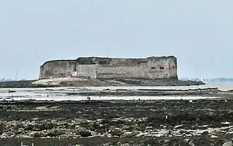 Fort Enet at low tide, with Fort Boyard (left) and Fort de la Rade on Île-d'Aix (right) in the background. -