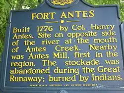 Fort Antes was a stockade surrounding the home of Colonel John Henry Antes, built circa 1778 in Revolutionary Pennsylvania in the United States. The fort was built under the direction of Colonel Antes, who was a member of the Pennsylvania militia. It was on the east side of Antes Creek, overlooking and on the left bank of the West Branch Susquehanna River on a plateau in Nippenose Township south of modern day Jersey Shore in western Lycoming County. The local militia held the fort for a short period of time until it was ordered to abandon Fort Antes during the Big Runaway by Colonel Samuel Hunter.[1] Despite being abandoned and attempts by the attacking British forces to burn it down, Fort Antes was one of only two structures in the valley to survive the Big Runaway.