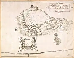Before Fort Belgica, there was a 16th-century Portuguese fort standing on a hill in Banda Neira. On September 4, 1611, Pieter Both, the first Governor-General of the Dutch East Indies, instructed the construction of a new fort to fortify the hill which dominated the original Dutch fortress, Fort Nassau.[1] This fort was to be named either Belgica or Nederland, and it became Fort Belgica.[2] Fort Belgica was a modest square fort on top of a hill.[2] In 1662, Jan Pieterszoon Coen ordered the renovation of the original fort, so it was replaced with a more solid redoubt that could accommodate 40 men.[3][2]