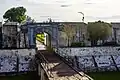 The fort has a rectangular layout, with an arrowhead-shaped bastion on each corner. The entrance to the fort is in the southwest, protected by a ravelin. A dry moat follows the trace of the fort. A wooden bridge spans the ditch that separates the main building from the front building. The southwest side has an arch entrance with a wooden door.[1] The fort encompasses 2.7 hectares, and stands on a site of 4.4 hectares.