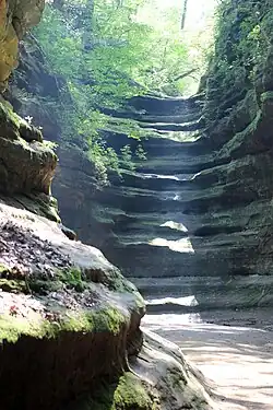 Starved Rock is known for its outcrops of St. Peter Sandstone. The sandstone, typically buried, is exposed in this area due to an anticline, a convex fold in underlying strata. This creates canyons and cliffs when streams cut across the anticline. The sandstone is pure and poorly cemented, making it workable with a pick or shovel.[7] A similar geologic feature is found by near the Rock River between Dixon and Oregon, Illinois within Castle Rock State Park.[8]