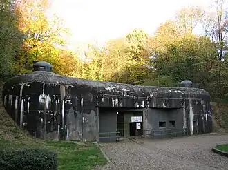 The fortification at Schoenenbourg is the one that saw the most combat between September 1939 and June 1940. Over this period, over 17,000 shells were fired from the fort, and it was itself the target of over 3000 shells and 160 bombs. Schoenenbourg was in action against the German 146th Infantry Division, which applied pressure along the Line.[20] On 19 June 1940, German Stukas attacked Schoenenbourg and other ouvrages, returning on the 20th and 21st. The attacks on the 21st were joined by a bombardment with 420 mm siege mortars, lasting three days. The bombardment cracked walls, but did not disable the position.[21] Schoenenbourg fired during this period in support of nearby casemates, not seriously affected by the bombardments. Schoenenbourg's turrets were retracted to receive the heavy shells, and raised during the lengthy reloading period for counterbattery fire. The inventory of German ordnance fired against Schoenenbourg was assessed after the armistice, and found to comprise 160 aerial bombs, 50 42 cm shells, 33 28 cm shells, and approximately 3000 smaller projectiles,[22] the most ammunition used against any fortification in France.[23] The final surrender of Schoenenbourg was effected on 1 July 1940, in accordance with the terms of the Second Compiègne armistice.[4][24][25] Following the surrender Schoenenbourg was used as a backdrop for propaganda films and as an indoctrination center for Hitler Youth.[26]