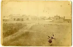 The Spirit Lake Tribe had faced severe hardship since arriving in the region, and the winter of 1866–1867 had been particularly difficult. As such, the first missions of the fort were to support the tribe and offer protection from raids.[3] The initial fort was meant to be temporary and was quickly constructed out of oak logs surrounded by an 18-foot-tall (5.5 m) log stockade[2] and spanned about 600 by 400 feet (180 by 120 m).[3] This lumber was provided by a sawmill at nearby Fort Stevenson.[3] By 1868, soldiers—United States Army infantrymen who were garrisoned there—were already constructing more permanent buildings, although official authorization from Congress to do this was not granted until April 6, 1869. The new main building was placed about 800 yards (730 m) south of the original log structure and was completed in 1871. The following decade saw a boom of new construction, expanding in a square pattern around a central plaza. This center yard was used for drills and military parades. New buildings included a hospital, mess hall, four barracks, storehouses, and multiple other stores and offices. All of these additions, including the main building, cost about $100,000. Most were built from bricks crafted from locally sourced clay and lime quarried at Devils Lake and placed on stone foundations. Later additions included corrals and stables for horses and livestock, a brewery, and a sutler. Besides one barracks building that was razed by fire, most buildings from this period are still standing and are maintained.[2] In 1873, Companies D and I of the 7th Cavalry Regiment joined the Fort Totten garrison and remained there until the fort's eventual closing; and until its closing, the fort was continuously manned. Soldiers here oversaw the 1874 establishment of the nearby St. Michael's Mission school.[2] Fort Totten was also the gathering point for an expedition to survey the border between the United States and British Canada in the 1870s.