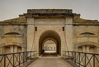 The preferred site was chosen in 1877 by a committee that included General Raymond Adolphe Séré de Rivières, and was expropriated from landowners that included the Prince Hénin. Construction began in 1878, with an approximate budget of 2 million francs-d'or. Construction was by Petit et Marey of Neufchâteau. Stone was quarried locally at Fréville and Rapailles, conveyed to the construction site by a railway line whose vestiges remain visible.[6] An 1880 project to install a Mougin casemate never came to fruition. The fort was away from the fighting during the First World War. During the Second World War the Germans used the fort as a depot. An explosion caused numerous German casualties. The Germans stripped the fort of armament and metals between 1941 and 1944.[7]
