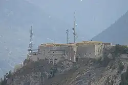 The site was first occupied by Marshal Berwick in the early 18th century.[2] The Fort du Télégraphe was completed between 1886 and 1890 as a part of the Séré de Rivières system of fortifications. It saw no action until 1940, when it fired on Italian forces with 155 mm guns.[1] The fort was part of the "Second Position" (Deuxième Position), a backup to the main fortifications of the modern Alpine Line, the southwestern component of the Maginot Line. The fort was armed with six 155 mm and four 95 mm guns, manned by the 6th battery of the 164th Position Artillery Regiment (164e Régiment d'Artillerie de Position (RAP)).[3]
