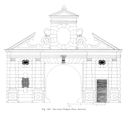 Between 1807 and 1812 city master builder Johann Hess constructed classical-style gate buildings with wrought-iron latticework in place of the demolished gates; they were closed each evening until 1864. The early-baroque front gates of the Galgentor and the Eschenheimer Tor, as can be seen on contemporary images, were incorporated into the new buildings, but had been demolished by the end of the 19th century.[52] The old armoury was deconstructed in 1886.