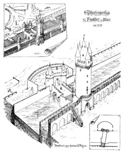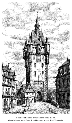 The Galgentor (gallows' gate) was the most important gate; the traffic from and to Mainz passed through it. The emperors also preferred to enter the city via the Galgentor during their elections. The gate had cuboid towers, constructed between 1381 and 1392. On the outer faces, below gothic baldachins, statues of Bartholomew the Apostle and Charlemagne stood either side of a Reichsadler, which stood on a lion.[28] One of the first towers was the Bockenheimer Tor, built between 1343 and 1346[29] The most important tower was the Eschenheimer Turm, constructed between 1400 and 1428 and still standing behind the eponymous city gate. It was the second tower to be built here. The foundation stone of its predecessor was laid in 1346.[30] The Friedberger Tor is recorded to have existed in 1346, but its tower was constructed in 1380. The tower was cuboid and had a high, hipped roof with a roof lantern on the top.[31] The construction date of the Allerheiligentor (All Hallows' Gate) is uncertain, with the sources giving dates from the 1340s to the 1380s.[32] The Sachsenhäuser Tor (Sachsenhausen gate) was more compact than the gates north of the Main. At the top of the gate, there was a cuboid tower. After 1552, the gate gained roundels on two sides; after 1769, the roof of the gate gained a small baroque tower to accommodate the chiming clock of the broken Sachsenhäuser Brückenturm.[33]