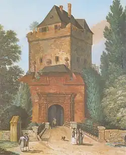The Guldenpforte was a round, undecorated tower with a conical roof. The Katharinenpforte consisted of two simple buildings, the outer gate and a stronger, cuboid inner tower with a high slate roof, a roof bay window and a roof lantern.[19] In the seventeenth and eighteenth centuries, the Katharinenpforte was expensively renovated several times to maintain the prison located within it. Apparently, the building was especially well-suited for this usage. A notable prisoner was de:Susanna Margaretha Brandt, the historical prototype of Goethe's Gretchen. She spent the five months between her apprehension and her execution in the tower.
