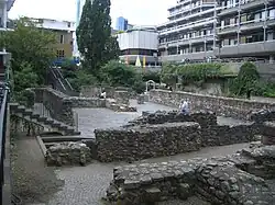 From 1953 to 1955, archaeologists continued the research and inspected the city wall in the area of the Hauptzollamt (today's Haus am Dom).[6] Archaeological studies of the area of the Saalhof from 1958 to 1961 by Otto Stamm proved the position of southern wall section along the Main and a short western part of the wall below the Saalgasse.[7] The last excavations directly connected with the historic wall were made in 1976, again on the premises of the Dompfarrhaus.[6] Archaeological research to establish the south-eastern and eastern location of the wall has not yet taken place. The stratigraphy in the area of the Römerberg was presumably significantly damaged by construction works in the Medieval period and destroyed by the construction of an underground car park in the 1970s, reducing the amount of information obtainable in this area.
