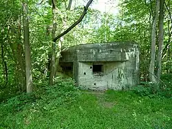 The defense of the area surrounding Strasbourg benefited from the width of the Rhine and its numerous oxbows and dead arms that complicate movement on the French side of the river. As with the sectors further south, three lines of fortifications were built: a line of casemates right on the riverbank, a line of infantry shelters a few hundred metres to the rear, and a line of heavier casemates between two or three kilometres back from the riverbank. No interconnected ouvrages of the type found in sections of the main Maginot Line just to the west were built in the Lower Rhine sector. Strasbourg, directly on the riverside, could not be defended in depth, and so made do with casemates on the riverbank.[1] Strasbourg was effectively considered an open city, as it could otherwise be easily destroyed by German artillery on the other side of the Rhine.[2] However, some of the German festungen from the late 19th century surrounding the city were reactivated from 1935, with blockhouses at Fort Pétain, Fort Ducrot and Fort Foch. Artillery positions were placed at Fort Ullrich, Fort Ducrot and Fort Ney-Rapp. 65mm naval guns were added at six additional positions. No substantial garrison was stationed at any of the old forts, only crews sufficient to serve the arms.[3]