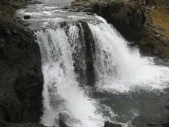 - Fossá: It is the right tributary of the Þjórsá river, merging with it near Routes 32 and 3365, near the Bjarnalón lake. The Þjórsá river is connected to the Búrfellsstöð hydroelectric power station. The source of Fossá is below 700 m above sea level in the vicinity of the Helgavatn lake, neighboring the Innri-Skúmstungná valley (to the east) and the Stóra-Laxá valley (to the north). This valley is home to several waterfalls, including Hjálparfoss and Hjálparfoss.