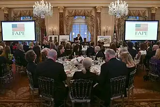 The Foundation for Art and Preservation in Embassies (FAPE) is a non-profit 501(c)(3), non-partisan organization dedicated to enhancing the United States' image abroad through American art. Founded as a public-private partnership in 1986, FAPE works with the U.S. Department of State to contribute fine art to U.S. embassies around the world. FAPE's donations include works by more than 145 American artists placed in over 70 countries. Headquartered in Washington, D.C., FAPE has raised over $42 million in art and monetary contributions.