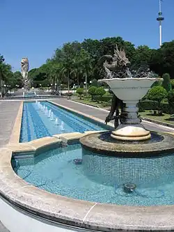 At the top of the Fountain Gardens terrace, there is a replica of the Villa Gamberaia landscape, a renowned 17th-century Italian Renaissance garden near Florence, Italy. It had a mini-stage for small performances. [1] The gigantic 37 metres (121 ft) Merlion Statue, representing the mascot and national personification of Singapore, was prominently seen above the promenade. [3]