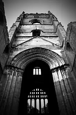 The original abbey church was built of wood and "was probably" two storeys high; it was, however, quickly replaced in stone. The church was damaged in the attack on the abbey in 1146 and was rebuilt, in a larger scale, on the same site. Building work was completed c. 1170.[41] This structure, completed around 1170, was 300 ft (91 m) long and had 11 bays in the side aisles. A lantern tower was added at the crossing of the church in the late 12th century. The presbytery at the eastern end of the church was much altered in the 13th century.[42] The church's greatly lengthened choir, commenced by Abbot John of York, 1203–11 and carried on by his successor, terminates, like that of Durham Cathedral, in an eastern transept, the work of Abbot John of Kent, 1220–47.[43] Similarities to the choir at Beverley Minster have been drawn by architectural historian Lawrence Hoey.[44] The 160-foot-tall (49 m) tower, which was added not long before the dissolution, by Abbot Huby, 1494–1526, is in an unusual position at the northern end of the north transept and bears Huby's motto: Soli Deo Honor et Gloria.[34] The sacristry adjoined the south transept.[45]