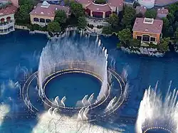Stages are sometimes set up on the lake for events or musical performances that incorporate the dancing fountains.[64][28] Britney Spears performed on the lake for the 2001 Billboard Music Awards,[65][66] and Drake did the same during the 2017 Billboard Music Awards.[64][28][67] Panic! at the Disco performed in 2018.[68]