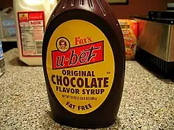 Fox's U-bet chocolate syrup is a commercial chocolate syrup originally made by H. Fox & Company in Brooklyn, New York starting c. 1900.[1][2] It was said to be invented in a basement in Brownsville, Brooklyn, according to David Fox. Herman Fox, his grandfather, left town for the Texas oil boom and returned only with the phrase "you bet."[3] U-bet syrup is best known as being a key component in the fountain beverage, the egg cream.[4] While the specific order in preparation is subject to much debate within New York City, the components of the classic egg cream recipe consist of U-Bet syrup, milk and seltzer. The beverage has since become an iconic staple in New York's Jewish delis since its invention in the 1880s.[5] H. Fox & Company was acquired by US Westminster Foods in 2016, and is currently manufactured in Farmingdale, New York.[6]