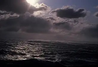 Unimak Pass (54°20′01″N 164°55′14″W / 54.33361°N 164.92056°W) is the widest of the Fox Islands Passes, being 9 or 10 miles wide in its narrowest part. It is clear of hidden dangers, free from dangerous tide rips, and the tidal current has less velocity than in the other passes. Except near shore, it is free of sudden blasts of wind descending from the mountainous coast to the sea, known as williwaws. It is the most desirable pass for sailing vessels, and also for all vessels not calling at Unalaska Bay. In approaching from the southward and eastward, care must be taken to keep clear of Sannak Reefs and Anderson and Lenard rocks. If very clear, the mountains of Unimak Island may be made out and the course for Unimak Pass shaped accordingly; but under ordinary conditions the hills back of Cape Khituk, or Ugamok Island, will be the first land sighted. If the weather is thick, soundings on Davidson Bank will be of use in feeling the way in to the land. In the vicinity of Cape Khituk the coast is bold and free from outlying dangers.
