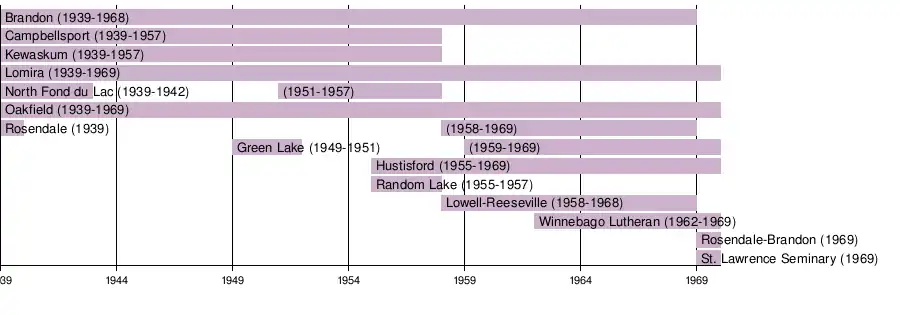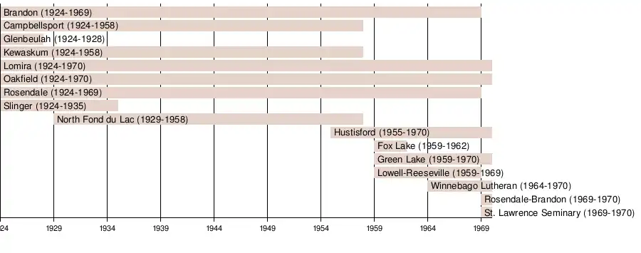 Like many conferences in rural areas during the 1950s and 1960s, consolidation of school districts had a great effect on conference affiliation. Fox Lake was the first conference member affected, as they left after consolidating with Waupun in 1962.[19] Winnebago Lutheran Academy would become the first private school to join the Fox Valley Tri-County League: first as a football-only member for the 1962 and 1963 seasons,[20] and then as a full member in 1964 after the dissolution of the short-lived Badger Lutheran Conference.[21] The conference also made the transition from eight-man to eleven-man football for the 1963 football season.[22] Two consolidations further whittled away conference membership in 1969. Brandon and Rosendale agreed to a merger of their two districts, and they combined to form a single athletic program until Laconia High School was completed in 1972.[23][24] In addition, Lowell-Reeseville consolidated with Juneau High School to form the new Dodgeland High School.[25][26] Rosendale-Brandon remained in the Fox Valley Tri-County League for its first season, while Dodgeland took Juneau's spot in the Eastern Suburban Conference.[27] St. Lawrence Seminary in Mount Calvary was added to the conference that year to put membership back up to seven schools.[28] They would only play one season in the Fox Valley Tri-County League, as the conference disbanded in 1970. Three members (Lomira, Oakfield and Rosendale-Brandon) became charter members of the Flyway Conference, two schools (St. Lawrence Seminary and Winnebago Lutheran) joined the new Bay-Lakes Conference, Green Lake joined the Dual County Conference and Hustisford joined the Eastern Suburban Conference.[29]