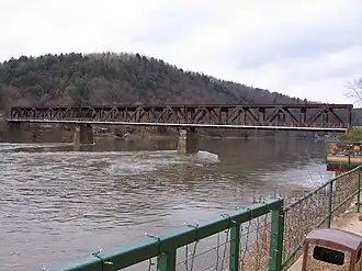 For more than 40 years, the bridge carried a branch of the Baltimore and Ohio Railroad's Northern Subdivision over the river. Embankments carrying the line on each side of the river were connected to the bridge by wooden trestles. The branch was closed in 1964; but the rails were not removed until the early 1990s. The route is now in the process of being converted to a rail trail. At the same time the Pennsylvania Railroad also had a line that ran through Foxburg but it too has been removed and is now in the process of becoming a long-distance walking route.