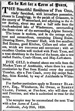 Robert Blakeney (1758-1822) appears to have made substantial alterations and additions in the early 1800s to an existing much older house which was on the site.[2] At this time the house was called Fox Gill. Robert was a friend of William Wordsworth who lived in the nearby house Rydal Mount and in 1814 Wordsworth wrote to him mentioning the windows in the house he was building.[3] Robert was a wealthy property owner who came from Whitehaven. He was the son of Captain George Augustus Blakeney and in 1780 married Elizabeth Burrows. His second wife was Margaret Edwards who he married in 1814. In 1820 he decided to rent the house and he placed an advertisement in The Westmorland Gazette which is shown.