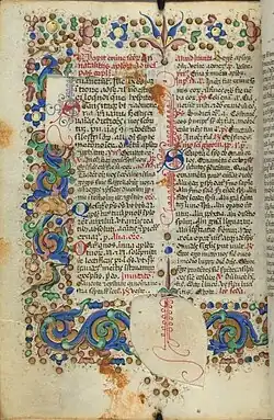 Beginning in the nineteenth century, collectors cut ornamented initial letters and miniatures from illuminated manuscripts. In the twentieth century some book dealers began removing leaves from manuscripts to be sold for greater profit as individual pages or keepsakes.[5] This "breaking" of manuscripts has been most common with books of hours which contain illuminated pages, gilding and attractive decorations. "As a result, today there are tens of thousands of single leaves in several hundred U.S. collections."[5] This practice continues today and many individual leaves of books of hours and antiphonals are available on eBay and from book and manuscript dealers.[6] Scholars strongly condemn this practice, even where the manuscript is incomplete to begin with, as it destroys the integrity and evidence of the entire manuscript. The most famous or infamous manuscript breaker was Otto Ege, who dismembered many complete and fragmentary manuscripts to sell the leaves individually or in large boxed collections.