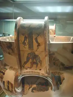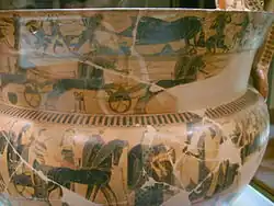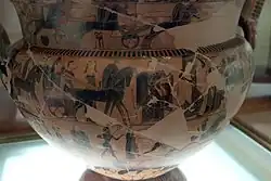 The François Vase, (or François Krater), is a large Attic volute krater decorated in the black-figure style. It stands at 66 centimetres (26 in) in height and was inspired by earlier bronze vases. It was used for wine. A milestone in the development of ancient Greek pottery due to the drawing style used as well as the combination of related stories depicted in the numerous friezes,[1] it is dated to circa 570/560 BCE. The François Vase was discovered in 1844 in Chiusi where an Etruscan tomb in the necropolis of Fonte Rotella was found located in central Italy. It was named after its discoverer Alessandro François,[2] and is now in the Museo Archeologico in Florence. It remains uncertain whether the krater was used in Greece or in Etruria, and whether the handles were broken and repaired in Greece or in Etruria. The François Vase may have been made for a symposium given by a member of an aristocratic family in Solonian Athens (possibly for a special occasion, such as a wedding), then broken and, after being carefully repaired, sent to Etruria, perhaps as an instance of elite-gift exchange.[3] It bears the inscriptions Ergotimos mepoiesen and Kleitias megraphsen, meaning 'Ergotimos made me' and 'Kleitias painted me'.[4] It depicts 270 figures, 121 of which have accompanying inscriptions.[5] It is highly unusual for so many to be identifiable: the scenes depicted represent a number of mythological themes.