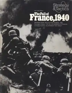 The Battle for France, 1940 was one of SPI's first products, designed by Jim Dunnigan, with graphic design by Redmond A. Simonsen. It appeared as a pull-out game in Strategy & Tactics #27.[3] Avalon Hill immediately bought the rights to the game, retitled it The Game of France, 1940: German Blitzkrieg in the West (also known as just France 1940), and published it as a slip-cover boxed game in 1972. The game proved to be reasonably popular, and in a 1977 poll conducted by Avalon Hill to determine their most popular products, The Game of France, 1940 ranked #10 out of 25 Avalon Hill games.[2]