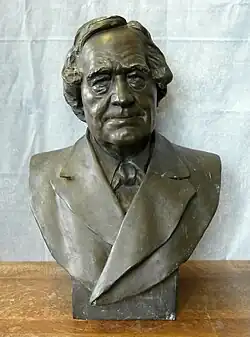 One of Darlington's works which drew public attention was the pair of life-sized bronze busts which were commissioned in 1906,[45] and which Darlington completed in 1907, at a cost of 90 guineas (equivalent to £12,627 in 2023) for the Ilkley Public Library.[24][46] One of the busts was a portrait of Reverend Dr Robert Collyer of New York, who had been a blacksmith in Ilkley when young. He had since been a benefactor to Ilkley and had donated 300 books to the new library.[47] The other was of Andrew Carnegie, who donated £3,000 (equivalent to £400,866 in 2023) for the construction of the library in 1907.[24][48] When the maquettes for the busts were offered for viewing, the Brighouse News said, "The representations are exceedingly life-like and natural, and should do much to increase Miss Darlington's reputation".[49]