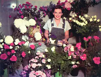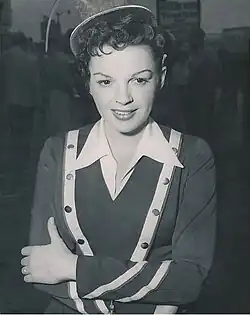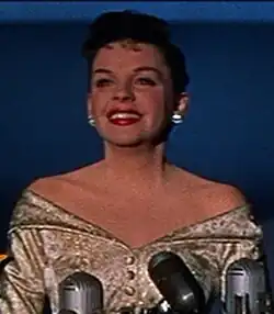 Several stories persist regarding the origin of their use of the name Garland. One is that it was originated by Jessel after Carole Lombard's character Lily Garland in the film Twentieth Century (1934), which was then playing at the Oriental in Chicago; another is that the girls chose the surname after drama critic Robert Garland.[17] Garland's daughter Lorna Luft stated that her mother selected the name when Jessel announced that the trio "looked prettier than a garland of flowers".[18] A TV special was filmed in Hollywood at the Pantages Theatre premiere of A Star Is Born on September 29, 1954, in which Jessel stated: