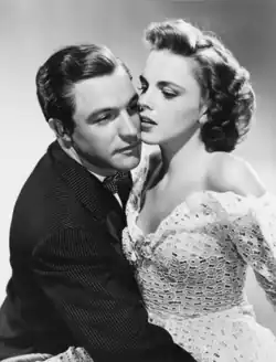 In her next film, For Me and My Gal (1942), Garland performed with Gene Kelly in his first screen appearance. She was given the "glamor treatment" in Presenting Lily Mars (1943), in which she was dressed in "grown-up" gowns. Her lightened hair was also pulled up in a stylish fashion. However, no matter how glamorous or beautiful she appeared on screen or in photographs, she was never confident about her appearance and never escaped the "girl-next-door" image that the studio had created for her.[56] She had a second abortion in 1943 when she became pregnant during an affair with actor Tyrone Power.[57]