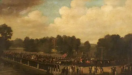 Bells were rung across Ashton-under-Lyne on his 25th birthday in 1804 and a large crowd gathered to celebrate.[17] He served two non-consecutive terms as High Sheriff of Cheshire in 1806 and 1807, and similarly large crowds gathered to celebrate his inaugurations, one of which was commemorated in an oil painting by an unknown artist.[21][22][23]