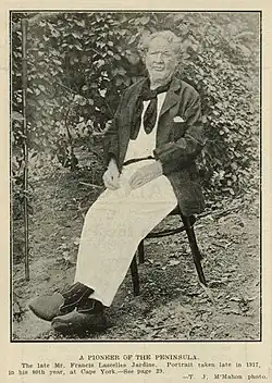 In 1897 Jardine was recommended to the position of General Inspector of the pearl fisheries in the Torres Strait, but the appointment was not forthcoming.[35] In the early 1900s he became a justice of the peace and presided over an inquiry into the whipping of an Aboriginal girl at Mapoon by a missionary.[36] Old age and illness, however, increasingly kept him at the deteriorating Somerset homestead.
