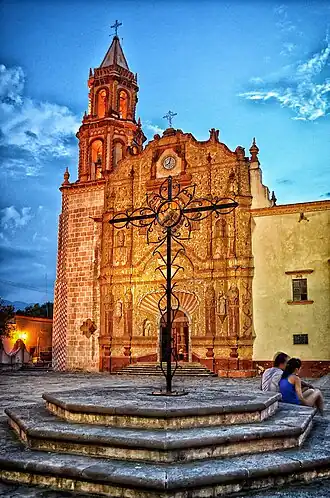 The Santiago de Jalpan mission was established before the arrival of Junípero Serra in 1744, but Serra was in charge of building the mission complex that stands today from 1751 to 1758, the first to be built. It is dedicated to James the Greater, the first evangelist.[6][12] This complex is situated in the center of the modern town in front of the main plaza and formed by an atrium, cloister, pilgrim portal and church, with a chapel annex on the left side. The original atrium wall was lost, but reconstructed in the same style, with three portals and inverted arches.[3] The main features of the ornate portal on the facade are Our Lady of the Pillar and the Virgin of Guadalupe, both with Mesoamerican connections, as well as a double headed eagle, meant to symbolize the blending of the two cultures.[6]