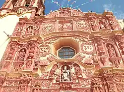 The interior has a number of sculptures including one of "Our Lady of Light."[13] The facade is marked by a rhomboid window surrounded by a representation of the cord Franciscans use to tie their habits. The basic theme of the facade is mercy, represented by interventions by the Virgin Mary and various saints. The iconography of this portal is the most elaborate of the five missions.[16][17] The facade consists of three bodies, a pediment and four estípite columns. The lower body has sculptures of Saints Peter and Paul and who Franciscan coats of arms. The second body has sculptures of Joachim and Saint Anne, with the Virgin Mary in her arms, and a niche in the center. There are also images from the Passion such as nails and a lance. This niche contained an image of Our Lady of Light, but it is empty now. Between the second and third bodies, there is a large window and above it, a representation of the stigmata of Francis of Assisi.