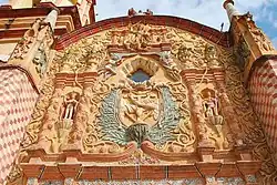 The facade is elaborately done in stucco and stone work, with ochre of the pilasters contrasting with the yellow of many of the decorative details. Much of the detail is vegetative, along with small angels and eagles.[15] European elements include images of saints such as Saint Dominic and Francis of Assisi and the Franciscan coat of arms. Inside the door, there are the images of Saints Peter and Paul. Native elements include a double-headed Mexican eagle devouring a serpent. On the upper left, there is an image of the Virgin of Guadalupe on the upper left, the Our Lady of the Pillar. These are the virgin images of Mexico and Spain respectively. This statue is said to have been taken by a general at the end of the 19th century. It was replaced by a more modern clock.[15][16] Inside, the cupola of the Jalpan mission contains scenes of the appearance of the Virgin of Guadalupe.[15][16][17]