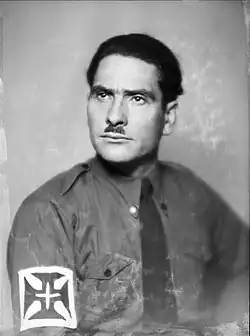 Francisco de Barcelos Rolão Preto, GCIH (12 February[1] 1893, Gavião – 18 December 1977, Hospital do Desterro, Lisbon) was a Portuguese politician, journalist, and leader of the Portuguese National Syndicalist Movement (MNS), a fascist organization. When in 1934 Salazar decided to ban the National Syndicalist Movement, Preto was briefly detained and later exiled. While in exiled and in Madrid, he was a guest in the house of José Antonio Primo de Rivera, with whom he collaborated in formulating a program for the Falange. In the eve of the Second World War he published a new editions of his work on Italian Fascism with high hopes on the Berlin-Rome axis.[2] After World War II, Rolão Preto abandoned fascism[3] and joined the left-wing forum Movement of Democratic Unity.[4] In 1949 he participated in General Norton de Matos’s 1949 presidential election campaign. He also backed more liberal candidates for the Presidency, such as Quintão Meireles, Francisco Higino Craveiro Lopes, and, ultimately, had a particularly important role (campaign press manager) in the 1958 campaign of another Salazar's opponent, General Humberto Delgado.[4]
