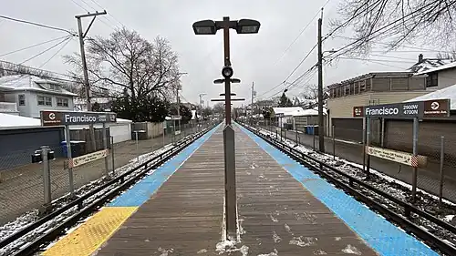 Francisco is an 'L' station on the CTA's Brown Line. It is an at-grade station with a single island platform, located in Chicago's Ravenswood Manor neighborhood at 4649 North Francisco Avenue. The adjacent stations are Kedzie, which is about 0.3 miles (480 m) to the west, and Rockwell, located across the Chicago River about 0.4 miles (640 m) to the east.