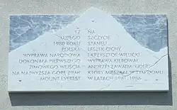 4 Francuska Street: memorial plaqueHouse at 4 Francuska Street – the Kossakowski villa from 1930 designed by Dionizy Cieślak. A characteristic feature of the house is the openwork pattern of the balcony railing supported by three pillars, repeated on the terrace enclosure and staircase railing leading to the high ground floor. The villa was featured in the film Black Pearl starring Eugeniusz Bodo and Lena Żelichowska.[28] The house was inhabited by Kazimierz Kossakowski.[21] In September 1939 and January 1945, the house was known as one of the few places in the area where there was a source of drinking water, thanks to a pump installed there in 1931.[29] Previously, on the property, there was a Royal Oak (Saxon Oak) destroyed during the war, whose successor was planted in 2012 on Nobel Street.[30] In 2011, the building was reprivatized.[31] At that time, there were 9 residents.[24]