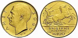 In 1939, during the Italian occupation, the 100 franga notes were overprinted to obscure the image of King Zog I.