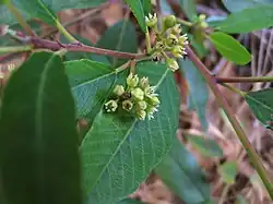 Blooming only in May and June,[7] the greenish-yellow flowers are 0.4 centimetres (1⁄8 in) wide and occur in leaf axil clusters, with 5 sepals and 5 shorter petals.[7]