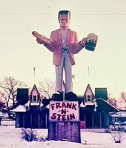 Frank-N-Stein was a one of a kind, large fiberglass sculpture similar to Universal Pictures' 1931 version of Frankenstein's Monster. It was located near the intersections of US Highway 12 and US Highway 20 in the Miller Beach and Aetna neighborhoods of Lake County, Indiana. The giant statue was designed by noted Indiana artist Richard Kishel and was displayed from 1967 to 1982.[1][2][3][4][5][6][7]
