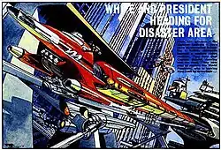 In November 1965, Bellamy left the fading Eagle to work for TV Century 21, where he drew the centrespread Thunderbirds strip. Rather than faithfully draw puppets, he took the artistic licence of rendering the characters as real people for a more exciting strip, as was already being done by the comic's other artists (including Ron Embleton and Mike Noble) in their strips. Apart from one short break, where Don Harley took over for 9 weeks, Bellamy drew Thunderbirds throughout its run in TV Century 21 and TV21, leaving shortly after the comic merged with Joe 90 Top Secret to become TV21 & Joe 90 in 1969. Bellamy also drew the colour splash pages for five Captain Scarlet and the Mysterons strips in the original run of "TV21". For the whole "TV21" Thunderbirds run, Bellamy created the double-page spread (plus a black and white page for 14 weeks) and then dropped back to just the double-page spread until issue 141 when the strip became two separate colour pages making syndication easier.[4] He continued drawing two colour pages until the final issue of the "TV21" (number 242). He then drew four "Thunderbirds" strips for the new "TV21 & Joe 90" before leaving the grind of weekly comic strip production behind.