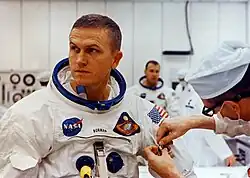 In June 1960, Borman was selected for Class 60-C at the USAF Experimental Flight Test Pilot School at Edwards Air Force Base in California, and became a test pilot. His class, which included Michael Collins and James B. Irwin, who also later became astronauts, graduated on April 21, 1961.[23] Thomas P. Stafford, another future astronaut, was one of the instructors.[24] On graduation, Borman was accepted as one of five students in the first class at the Aerospace Research Pilot School, a postgraduate school for test pilots to prepare them to become astronauts. Fellow members of the class included future astronaut Jim McDivitt.[25] Classes included a course on orbital mechanics at the University of Michigan, and there were zero-G flights in modified Boeing KC-135 Stratotanker and Convair C-131 Samaritan aircraft. Borman began training with the Lockheed F-104 Starfighter. It would be flown up to 70,000 feet (21,000 m), where the engine would cut out for lack of oxygen, and then coast up to 90,000 feet (27,000 m). This would be followed by a powerless descent, and restarting the engine on the way down. A pressure suit was required.[26]